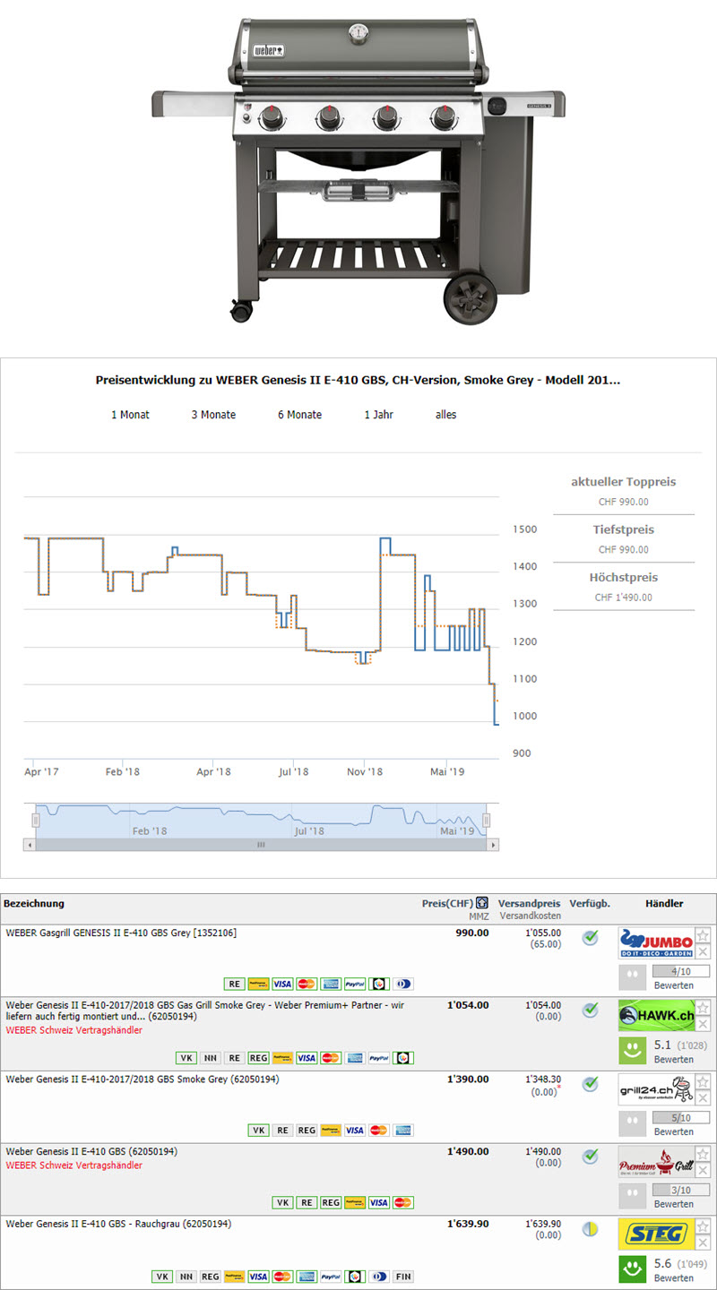 Aktuell gibt es bei Jumbo den Weber Gasgrill GENESIS II E-410 GBS (grey) zum Bestpreis von CHF 990.- wenn man den Grill in einer Filiale abholt (bei einer etwaigen Lieferung fallen zusätzliche Kosten an).