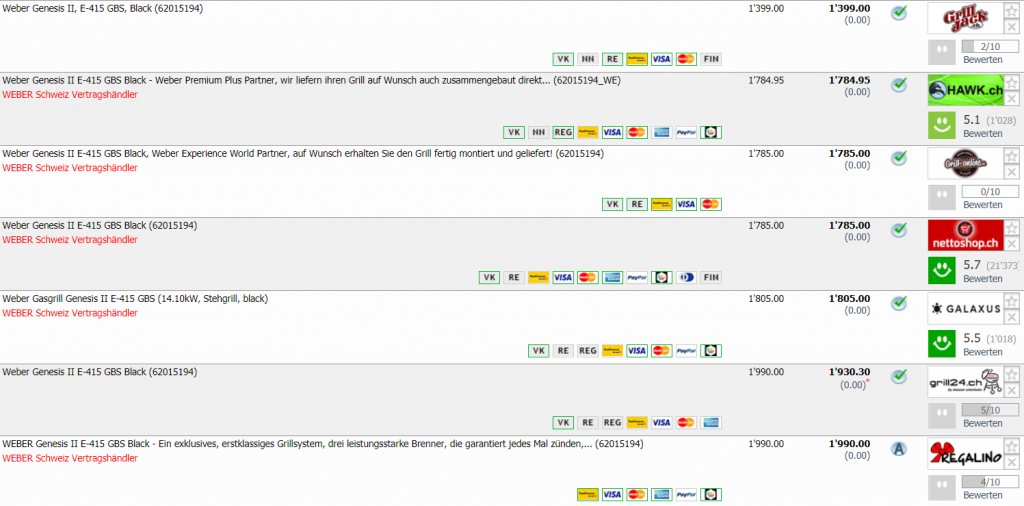 Bei Grill Jack gibt’s gerade den WEBER Genesis II E-415 GBS, CH-Version in Aktion für CHF 1399.- Zweitbester Preis liegt bei CHF 1784.95 was gleichzeitig der Bestpreis ist.