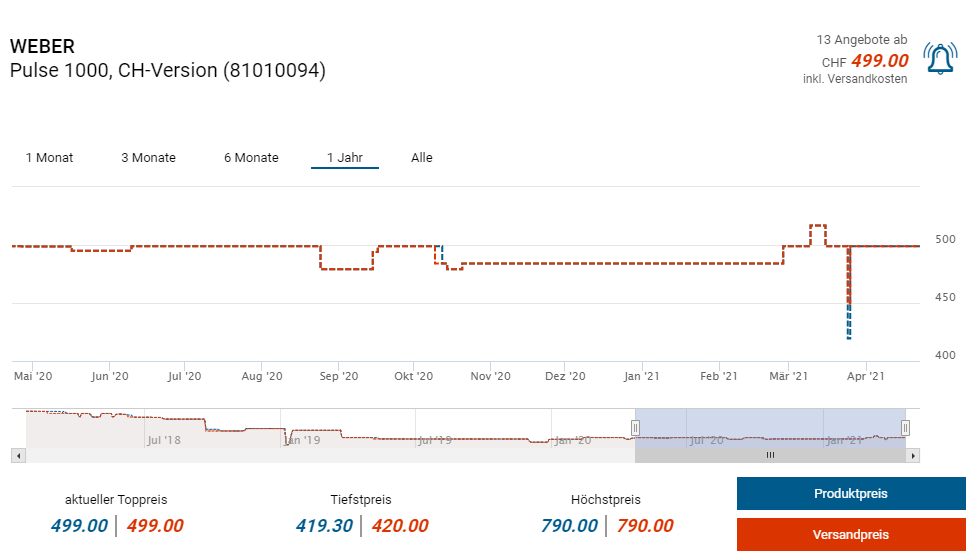 Bis 18 Uhr gibts beim Daydeal Grill-Special den Elektrogrill Weber Pulse 1000 zum Aktionspreis von 449 Franken. Zwar lag der Bestpreis laut toppreise auch schon bei 420 Franken vor mehr als 2 Jahren, sonst gabs den Grill aber selten so günstig.