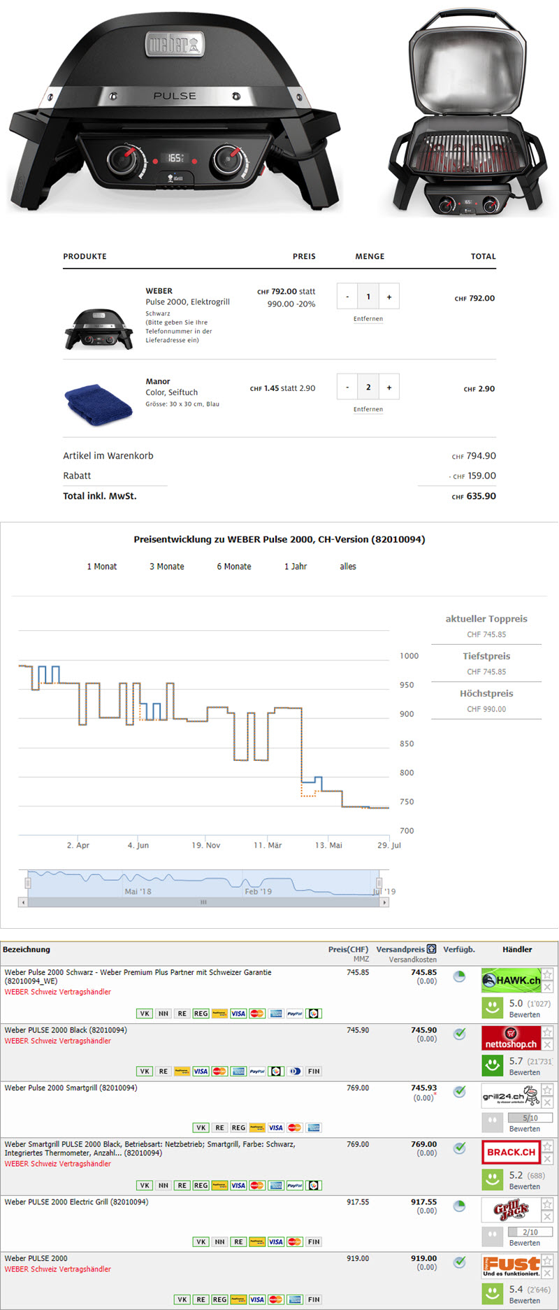 Im Sale von Manor gibt es aktuell den Weber Pulse 2000 Elektrogrill zum Bestpreis von CHF 635.90 wenn man nebst dem Grill selbst noch zwei weitere, reduzierte Artikel (z.B. diese kostengünstigen Seiftücher) in den Warenkorb legt (in diesem Preis ist die kostenlose Lieferung ebenfalls inbegriffen).