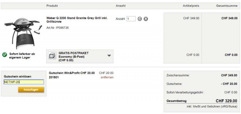 Nun hat mich M0rph auf ein tolles Angebot hingewiesen. Und zwar gibt’s bei nettoshop den Weber Q 2200 Stand Granite Grey Grill inkl. Grillbürste zum absoluten Bestpreis von CHF 329.- (Preisverlauf siehe oben). Der momentan zweitbeste Preis in der Schweiz liegt bei CHF 525.- Der günstigste jemals gemessene Preis beträgt CHF 399.-