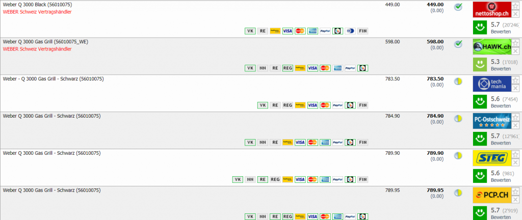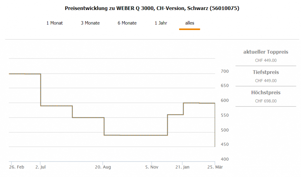 Bei nettoshop erhält man den WEBER Q 3000 für CHF 449.- Zweitbester Preis in der Schweiz liegt bei CHF 598.- Bestpreis war bei CHF 488.95