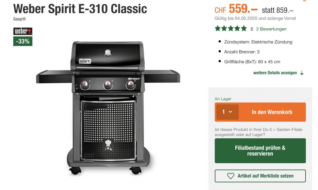 Bei Migros Do It Garden sind seit heute einige Weber und Outdoorchef Gasgrills im Angebot, meiner Meinung nach ist der Weber Spirit E-310 das beste Angebot.