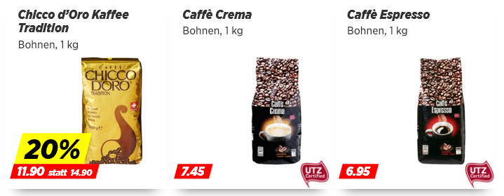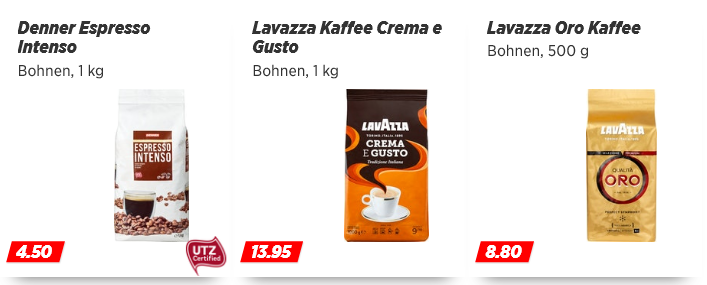 Habt ihr euch evtl. eine neue Siebträgermaschine aus dem Fust-Deal von rags zugelegt und sind noch auf der Suche nach den entsprechenden Bohnen? Dann auf zum Denner. Dieser hat heute Freitag und morgen Samstag eine Aktion von 30 % auf alle Bohnen, auch auf bereits reduzierte Produkte. Das heisst, die 30 % werden von den auf der Webseite angegebenen Preisen noch abgezogen.