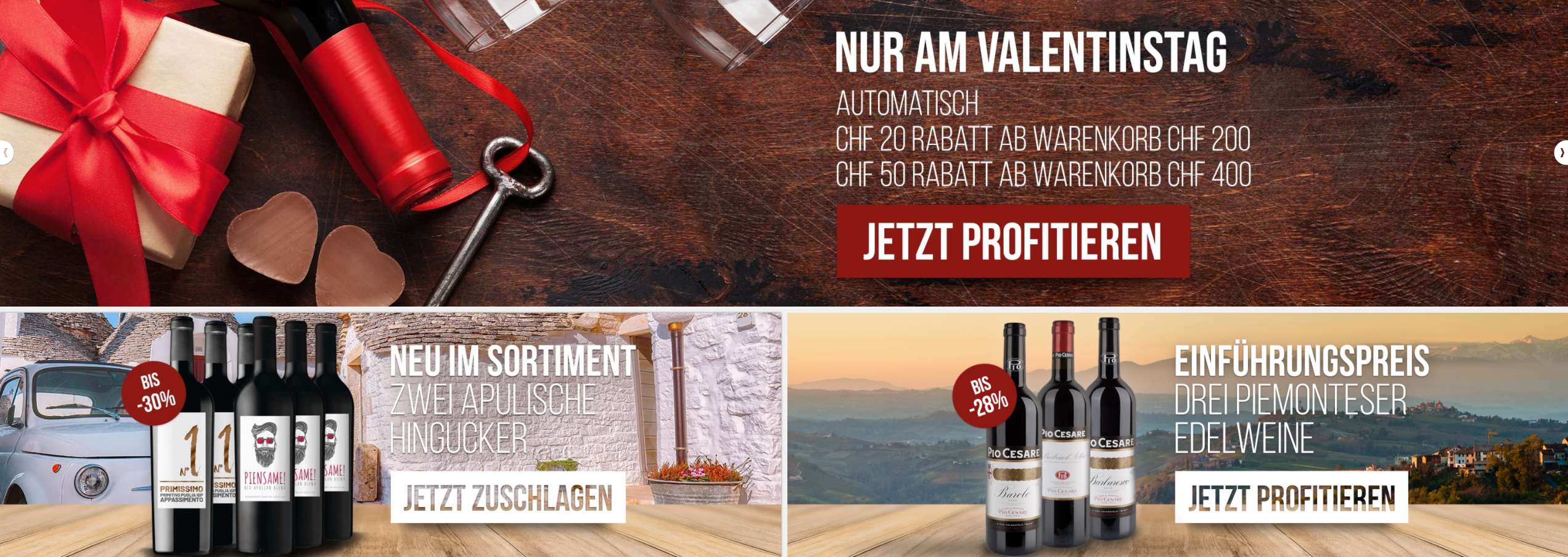 Aktuell gibt es bei Weinclub eine sehr starke Promotion zum Valentinstag (nur heute gültig). Für registrierte Kunden ist die Lieferung kostenlos. Ab einem Bestellwert von CHF 200.- gibt es automatisch einen Rabatt von CHF 20.-, ab einem Bestwellert von CHF 400.- sogar CHF 50.- Rabatt. Der Rabatt lässt sich auch auf bereits reduzierte Weine anwenden, somit lässt sich gleich doppelt sparen!