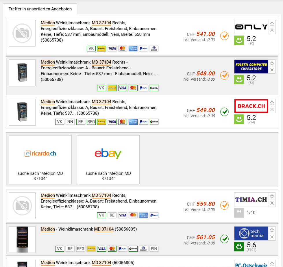 Bei Daydeal gibts diese Woche den Weintemperierschrank MD 37104 von Medion zum Aktionspreis von 449 Franken. Laut toppreise starten die Preise derzeit bei 541 Franken.