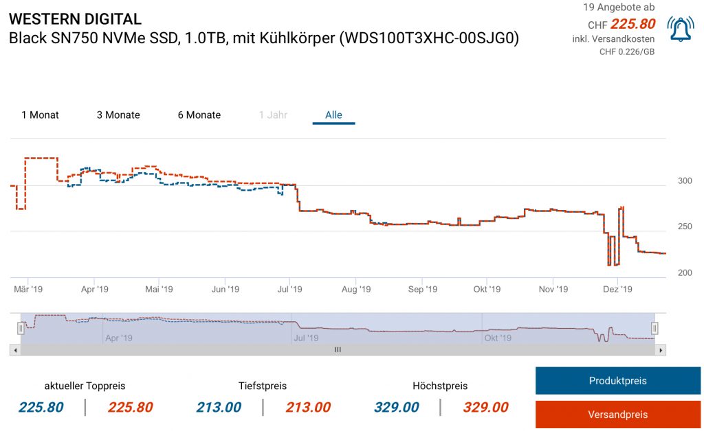 Bei amazon.es gibt es aktuell die WESTERN DIGITAL Black SN750 NVMe SSD, 1.0TB, mit Kühlkörper für 99.99 EUR.