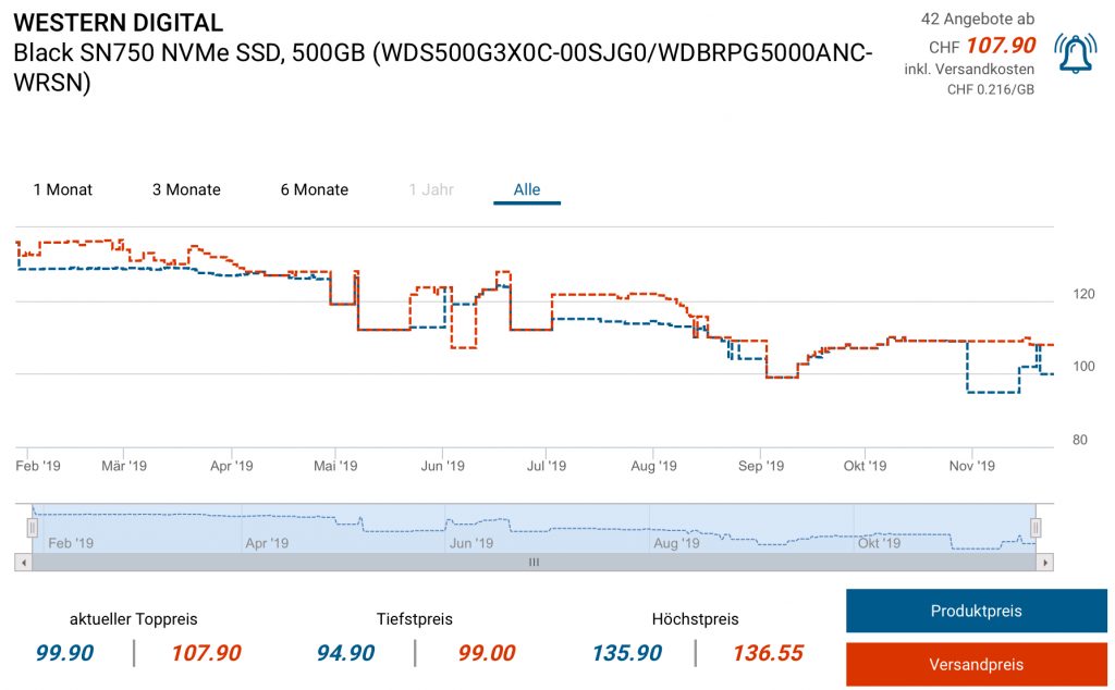 500GB für 79.99 EUR, mit Versand in die Schweiz für 72.40 EUR / ~80.- CHF, zweitbester Preis gemäss toppreise 107.90 CHF