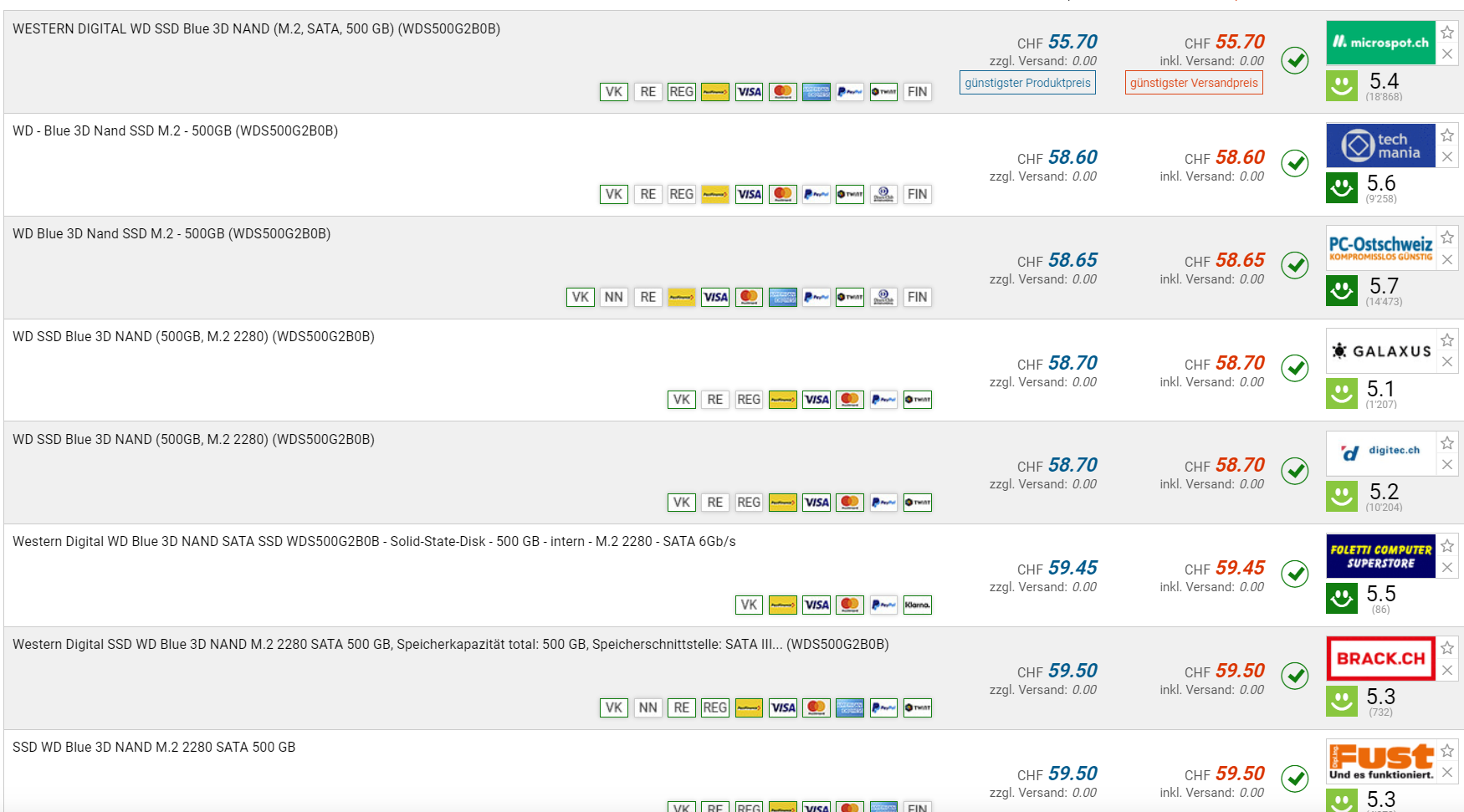 Bei Amazon.fr gibt’s gerade die WESTERN DIGITAL Blue 3D NAND SSD M.2, 500GB für umgerechnet CHF 48.65 inklusive Versand in die Schweiz und Verzollung. In der Schweiz kostet das Teil ab CHF 55.70