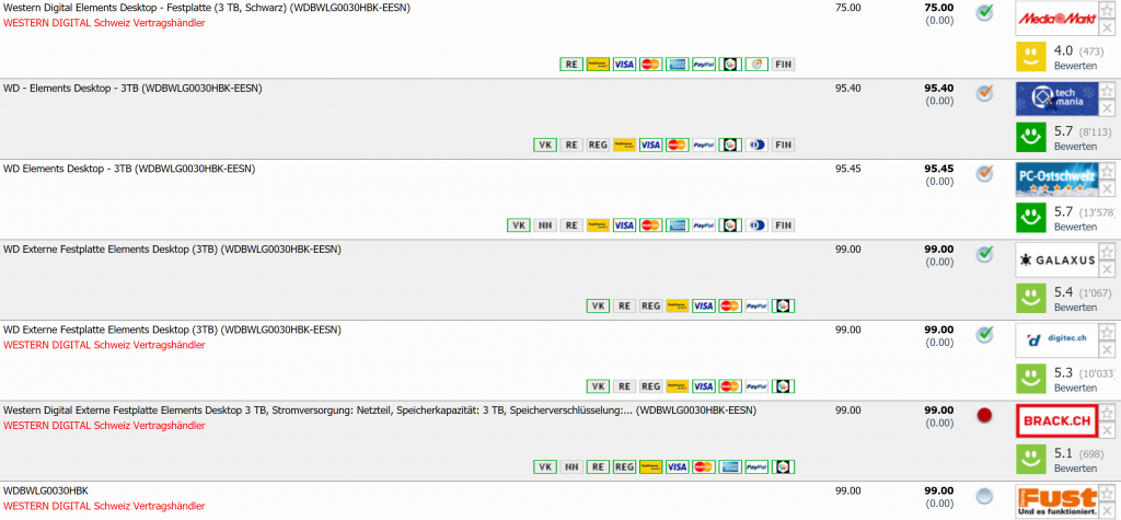 Bei MediaMarkt gibt’s die 3TB WESTERN DIGITAL Elements Desktop Festplatte für CHF 75.- Zweitbester Preis ist bei CHF 95.40, Bestpreis war um CHF 80 herum.