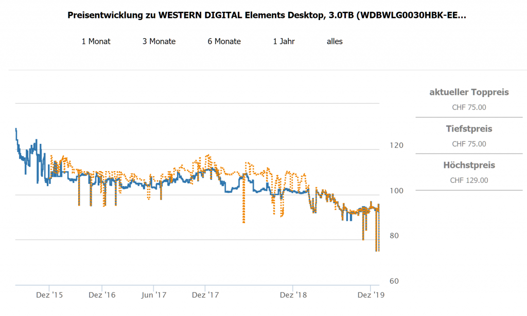 Bei MediaMarkt gibt’s die 3TB WESTERN DIGITAL Elements Desktop Festplatte für CHF 75.- Zweitbester Preis ist bei CHF 95.40, Bestpreis war um CHF 80 herum.