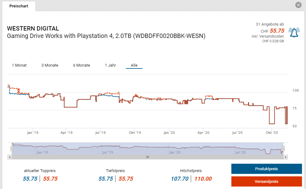 Bei Media Markt gibt es momentan die WESTERN DIGITAL Gaming Drive 2TB HDD zum Bestpreis von CHF 55.75. Diesen Preis gab es bereits im September. Der zweitbeste Preis beträgt CHF 80.20.