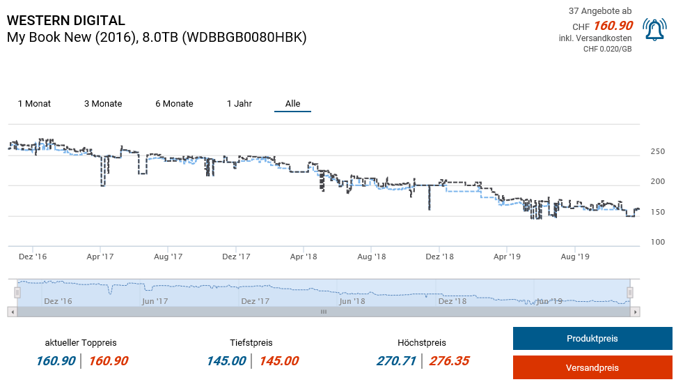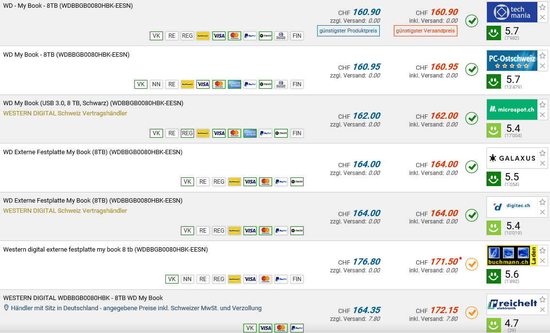 Für wen es noch etwas mehr sein darf, gibt es die 12TB für 209.99 EUR, mit Versand in die Schweiz für 190.05 EUR / 209.- CHF, zweitbester Preis 303.65 CHF.