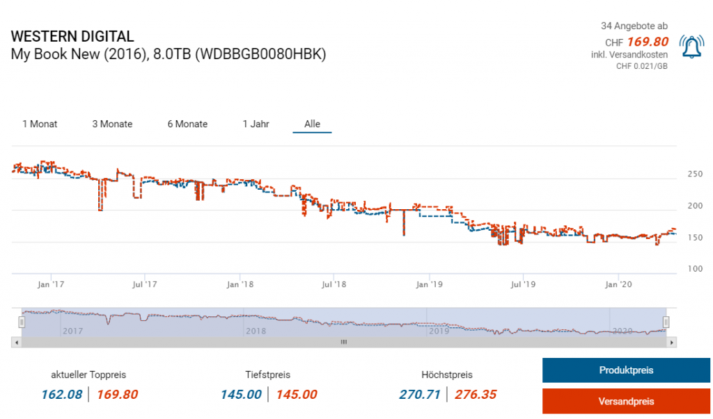 Bei Amazon.de gibts ein weiteres gutes Festplatten-Angebot. So gibts die 8TB-Variante der My Book Reihe für ca. 148 Franken. Zuletzt gabs bei amazon.it die 10TB-Ausführung für ca. 163 Franken in diesem Deal. Wer das Angebot verpasst hat der bekommt hier eine akzeptable Alternative, wenn auch mit 2TB weniger Speicher.