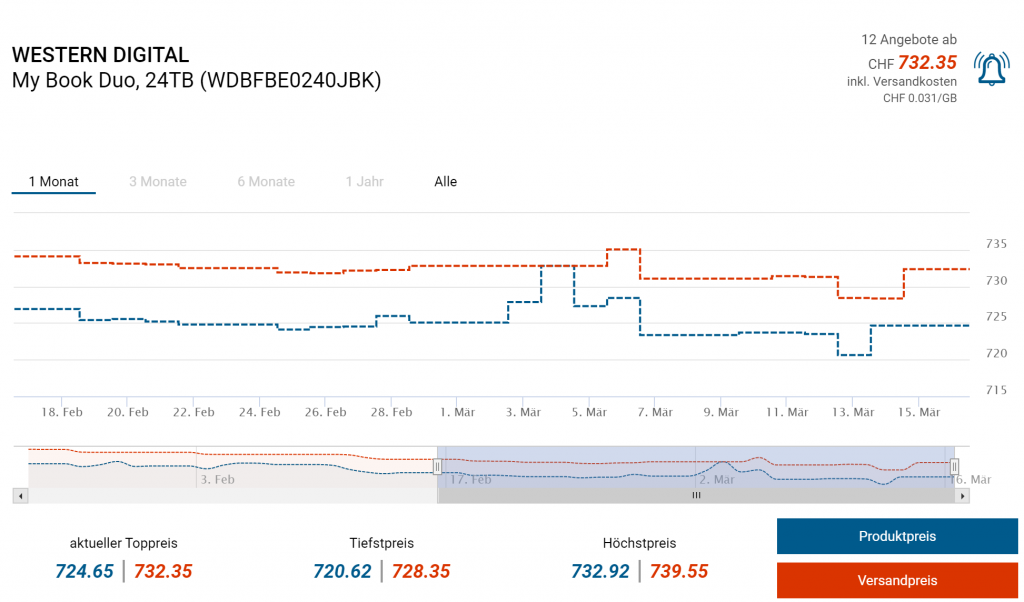 Bei Amazon Spanien gibt’s gerade die WESTERN DIGITAL My Book Duo, 24TB für CHF 488.- inklusive Lieferung und Verzollung. In der Schweiz kostet der Artikel ab CHF 732.35 Bestpreis war bei CHF 720.-