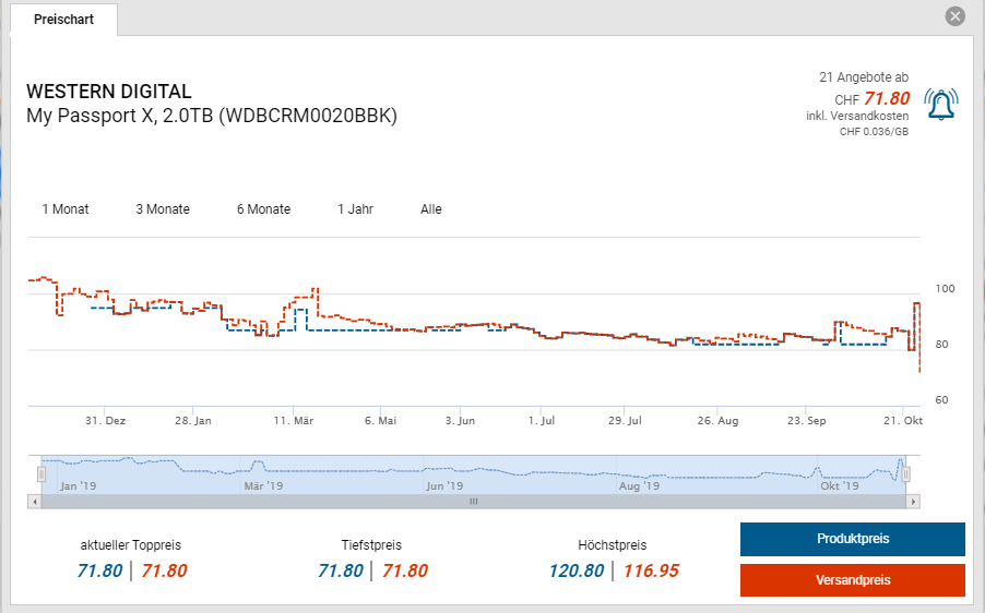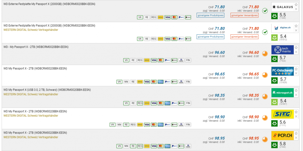 Bei galaxus und dem Schwestern-Shop digitec gibt es die WESTERN DIGITAL My Passport X, 2.0TB Festplatte für den neuen Bestpreis von CHF 71.80. Der vorherige Bestpreis war CHF 79.95. Der zweitbeste Preis beträgt CHF 96.90.