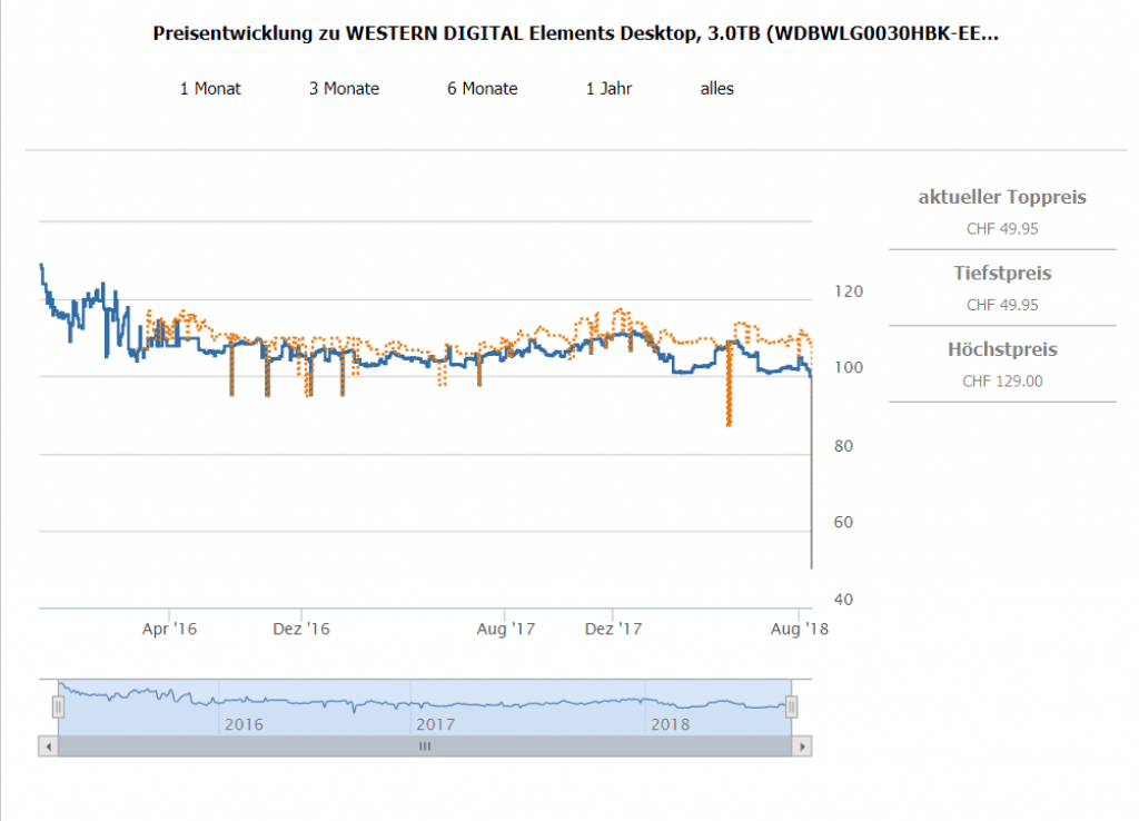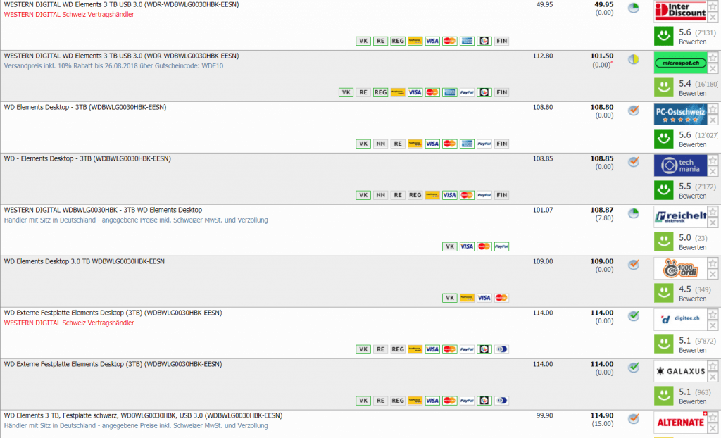Bei Interdiscount gibt’s gerade die WESTERN DIGITAL WD Elements 3 TB mit USB 3.0 für CHF 49.90. Laut toppreise gab es die externe Festplatte noch nie unter CHF 87.- Der zweitbeste Preis in der Schweiz liegt momentan bei CHF 101.50