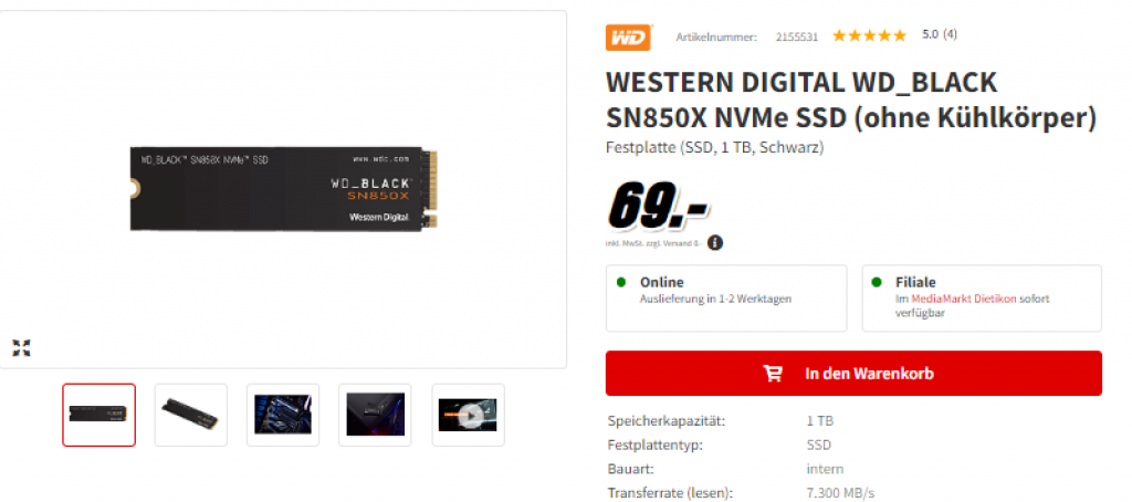 WESTERN DIGITAL WD_BLACK SN850X NVMe SSD 1 TB (ohne Kühlkörper) Festplatte kaufen | MediaMarkt für CHF 69.- (alterativ auch bei digitec und Fust)