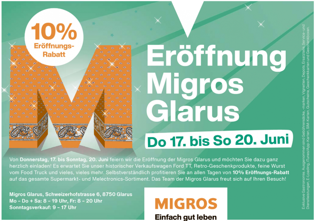 Vom Do. 17.06.2021 bis So. 20.06.2021 wird die Migros Glarus (direkt beim Bahnhof SBB) nach einer längeren Umbauphase inkl. Restaurant und melectronics wiedereröffnet. Es erwartet Sie unser historischer Verkaufswagen Ford TT, Retro-Geschenkprodukte, feine Wurst vom Food Truck und vieles, vieles mehr.