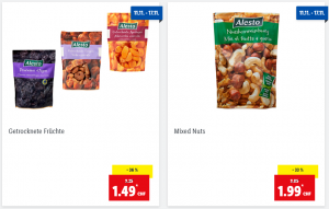 Im Lidl findet ihr getrocknete Früchte der Marke Alesto in verschiedenen Sorten wie z.B. entsteinte Pflaumen, Aprikosen oder Feigen. In der 200 g Packung für je CHF 1.49. Wer es lieber etwas nussiger mag, greift zur Nusskernmischung in der 200 g Packung für CHF 1.99.