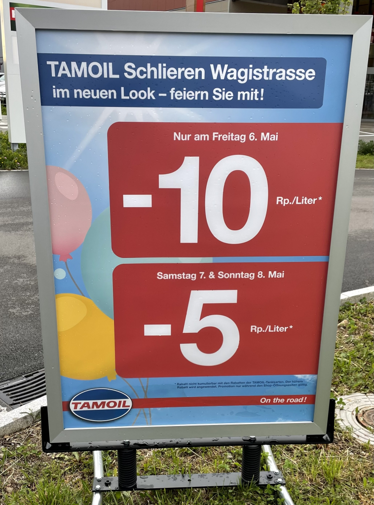 Am Samstag und Sonntag gibts dann noch 5 Rappen Rabatt, lohnt sich aber weniger.