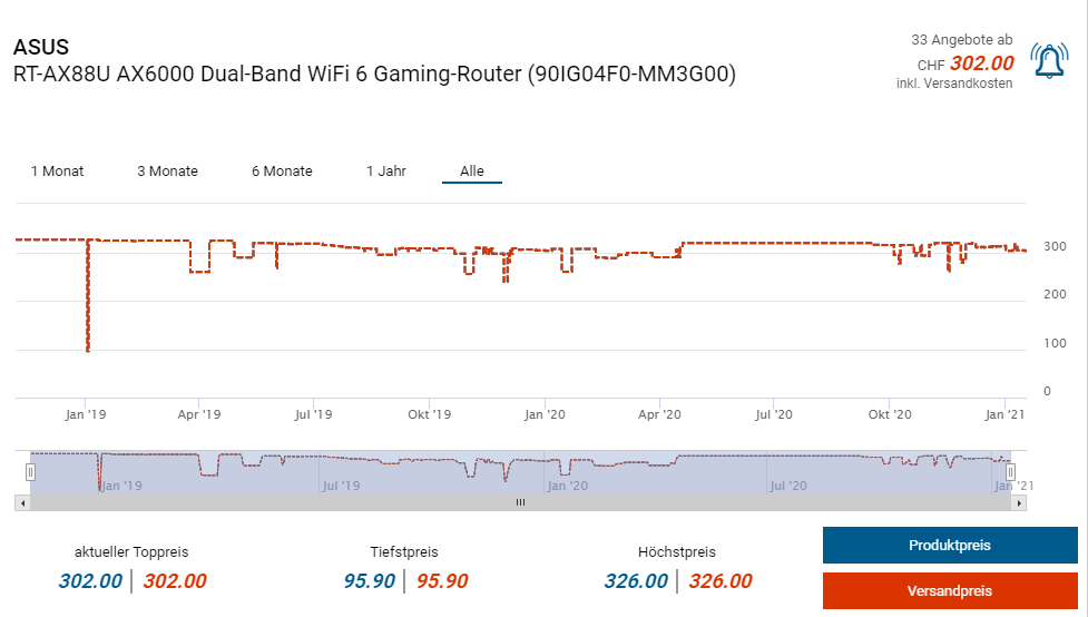 Bei Amazon gibts derzeit den Gaming-Router RT-AX88U von Asus zum Aktionspreis von knapp 272 Franken. Laut toppreise starten die Preise in der Schweiz bei 302 Franken. Der Hick bei 95 Franken dürfte mit höchster Wahrscheinlichkeit ein Preisfehler gewesen sein 😀
