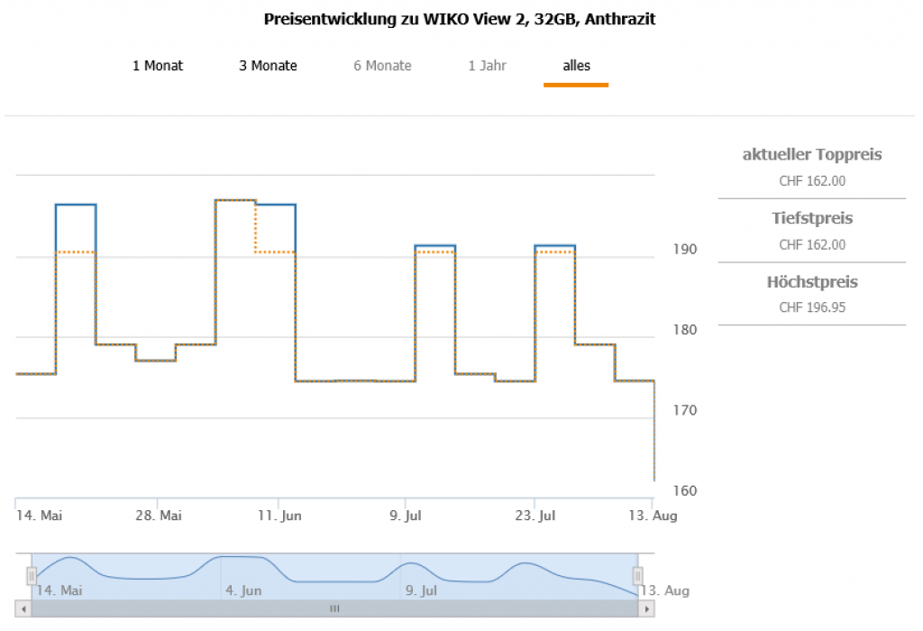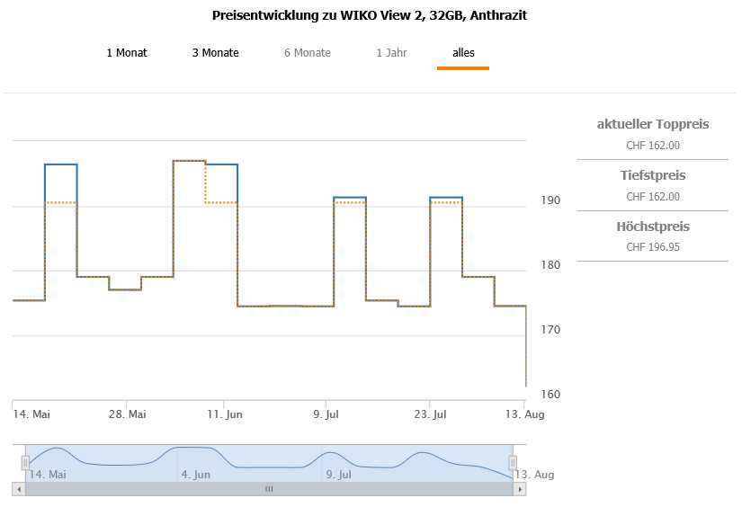Gemäss toppreise gab es das Handy (über alle Farben) bislang nie günstiger als für 171.90 CHF, der zweitbeste Preis liegt momentan bei 172.90 CHF (Gold) bzw. 184.10 CHF (Anthrazit).