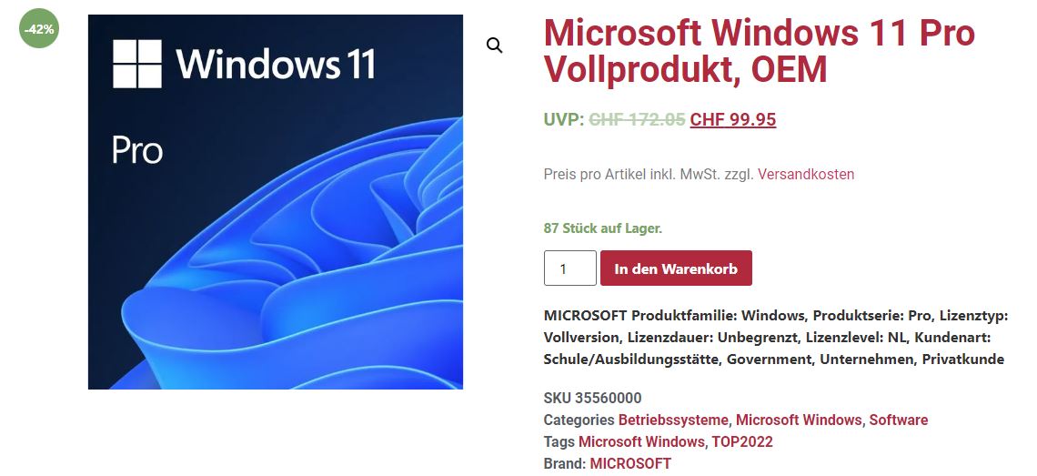 Windows 11, Pro für 99.95 CHF bei dealpro.ch