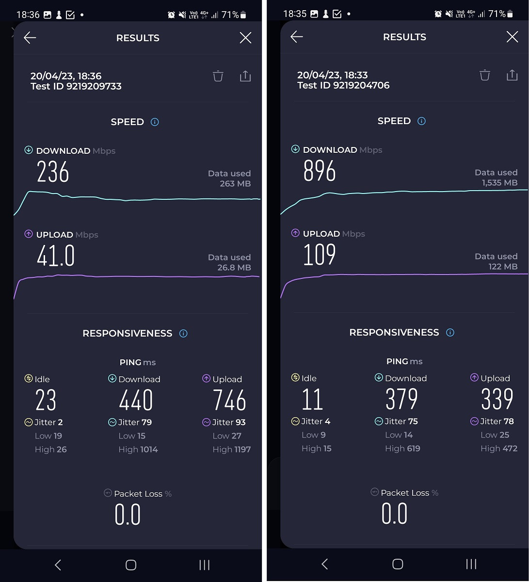Ich habe es aus Neugier auch mal ausprobiert (links 4G+, rechts 5G). Bei mir ist das ein rechter Unterschied. Ich zweifle noch, ob es sich aktuell wirklich lohnt, wenn schon 4G+ so gut funktioniert, aber mich nimmt vor allem die tieferere Latenz im Alltag wunder.