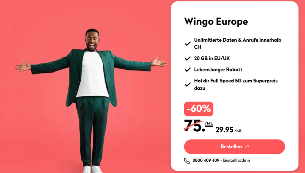 Bei Wingo könnt ihr mal wieder vom Wingo Europe (Swisscom-Netz, CH alles unlimitiert, 20 GB EU/UK-Roaming + gratis Aktivierung und 5G-Option für CHF 5.–) zum Preis von 29.95 Franken pro Monat profitieren.