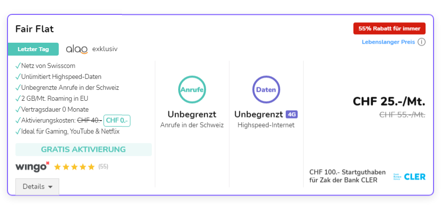 Wingo Fair Flat + CHF 100.- ZAK Startguthaben bei Alao