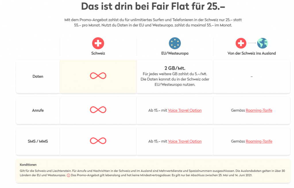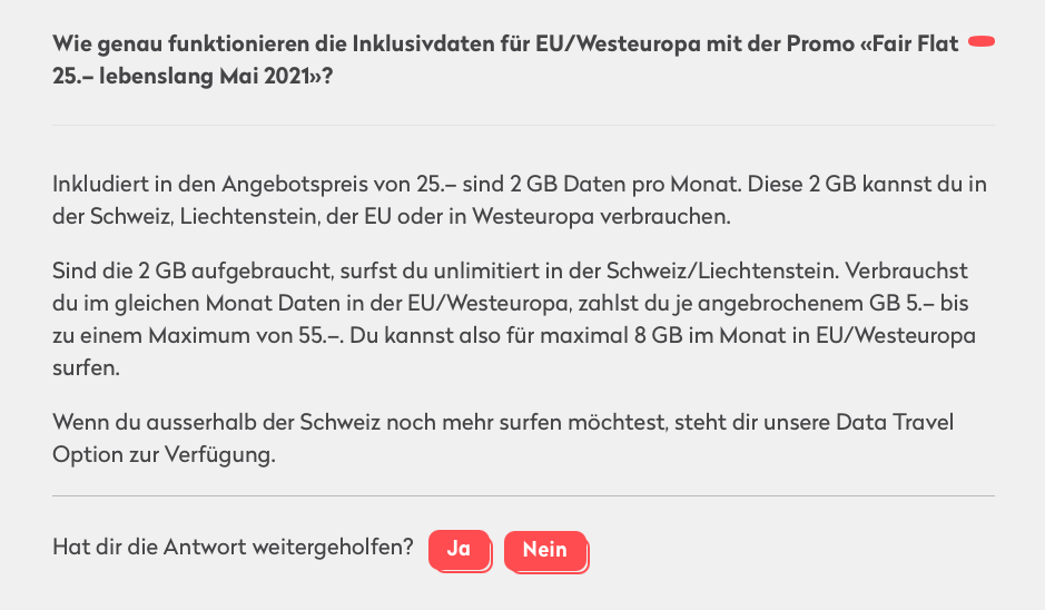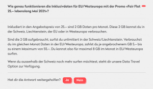 Das ist ein gewaltiger Pferdefuss und ich wäre fast darauf reingefallen. Wenn man sich nur die Grafik anschaut, könnte man meinen, man habe fix 2GB Datenvolumen für die EU/Westeuropa. Aber dass von diesen 2GB auch die Daten abgezogen werden, die in der CH verbraucht werden, war mir so im ersten Moment nicht bewusst. Danke für die Warnung :)