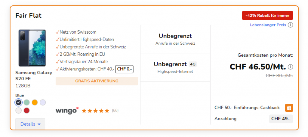 Bei Alao gibt’s gerade ein spannendes Angebot für das sehr beliebte Wingo Fair Flat Abo in Kombination mit dem Samsung Galaxy S20 FE mit 128 GB Speicherplatz. So bezahlt man total (bei einer Berechnung von 24 Monaten) CHF 1090.- statt CHF 1190.-: