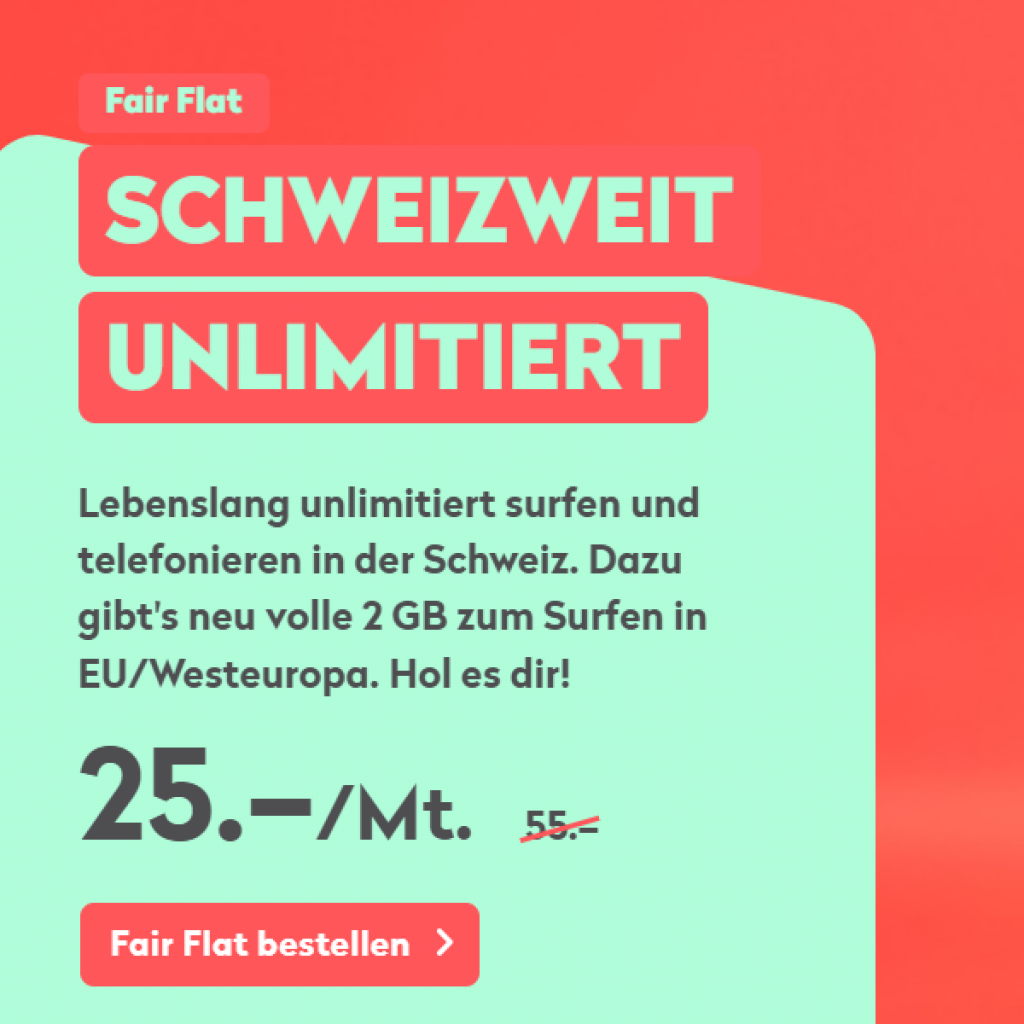 Lebenslang unlimitiert surfen und telefonieren in der Schweiz. Dazu gibt’s neu volle 2 GB zum Surfen in EU/Westeuropa.