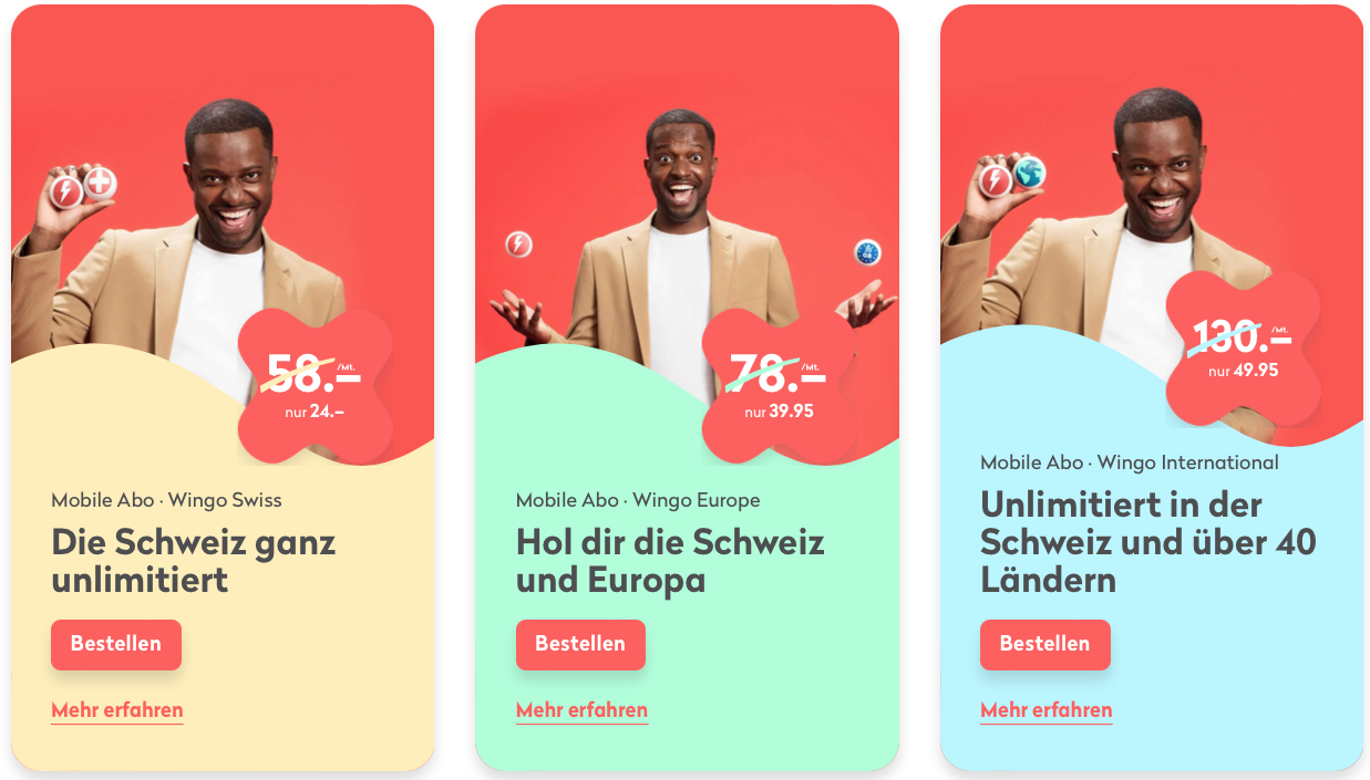 Wingo Europe 39.95 statt 78.- (Unlimitiert surfen, telefonieren und Nachrichten schreiben in der Schweiz und Liechtenstein. Innerhalb EU/Westeuropa telefonierst du unlimitiert und hast 20 GB zum Surfen.)