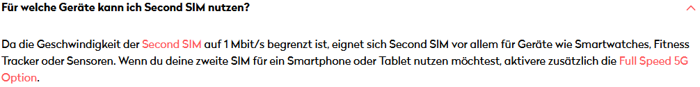 Die Second SIM wird möglicherweise aufs 5G-Netz zugreifen können (konnte der Support nicht abschliessend bestätigen, wird man dann sehen müssen), aber die Geschwindigkeit bleibt trotzdem auf 1 Mbit/s begrenzt. Auch ab Juli wird die Second SIM nur mit der "Full Speed 5G"-Option die volle Geschwindigkeit nutzen können.