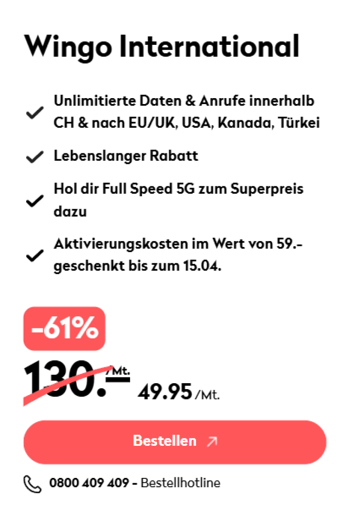 Hast du dieses Abo schon? Gib den Promocode INT25APR in deinem Kundenportal myWingo ein unter «Mein Abo», um von diesem Angebot zu profitieren. Wenn du ein anderes Wingo Abo hast und von diesem Angebot profitieren möchtest, kannst du ohne Promocode in deinem Kundenportal unter «Mein Abo» einfach wechseln.