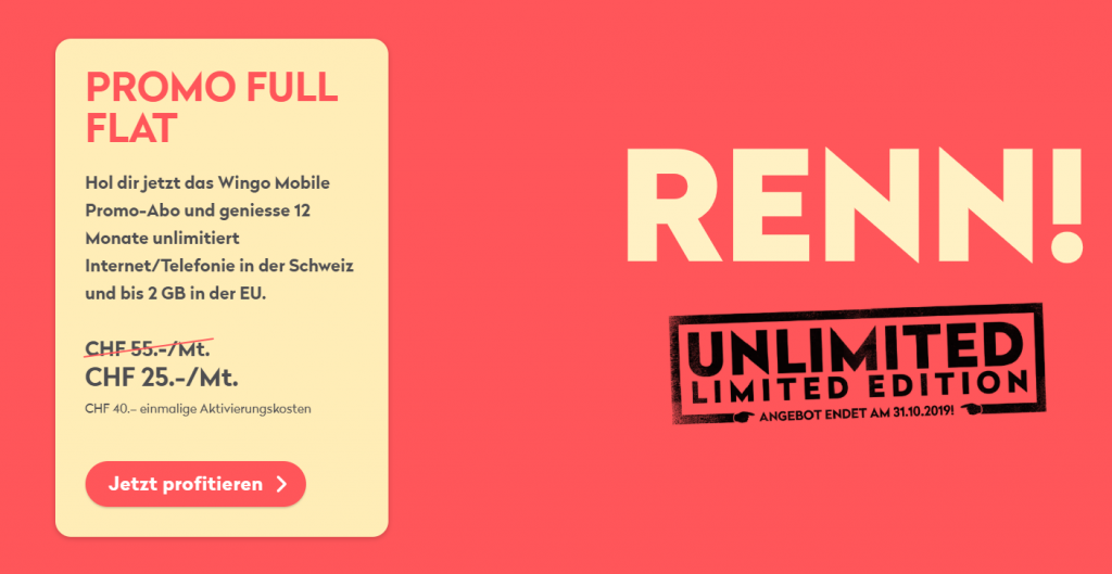 Bis am 14.04. gibt’s bei Wingo noch das Abo Fair Flat in Aktion für CHF 25.- statt dem Normalpreis von CHF 55.- Der Preis ist allerdings nur während 12 Monate gültig – man kann das Abo aber vorab kündigen, da es keine Mindestvertragslaufzeit gibt.