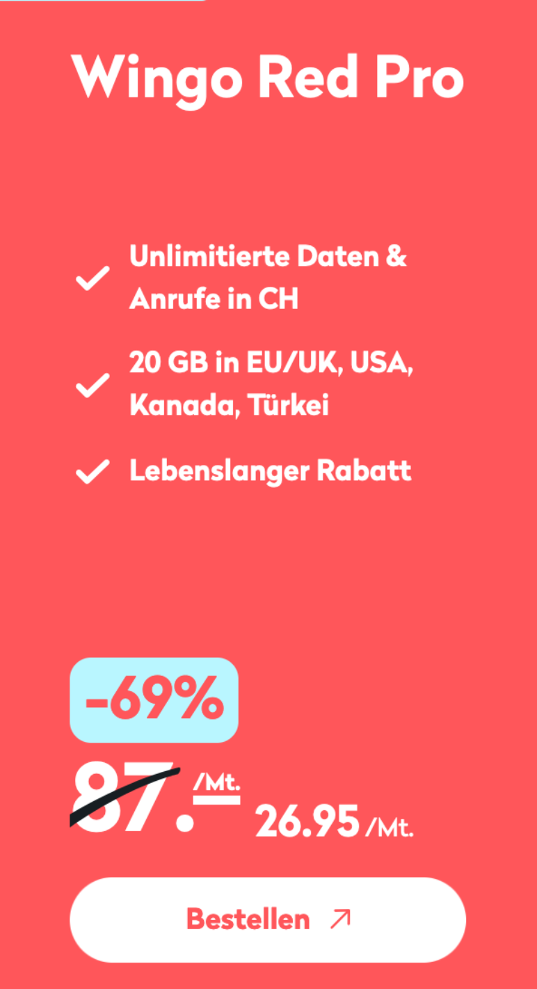 26.95/Monat zahlen wir aktuell bei meiner Frau für den Vertrag. Die Erhöhung von 1 CHF wurde noch nicht dazugerechnet. Würde heissen dass dieses Wingo Red Pro Abo um 3 CHF teurer geworden ist..
