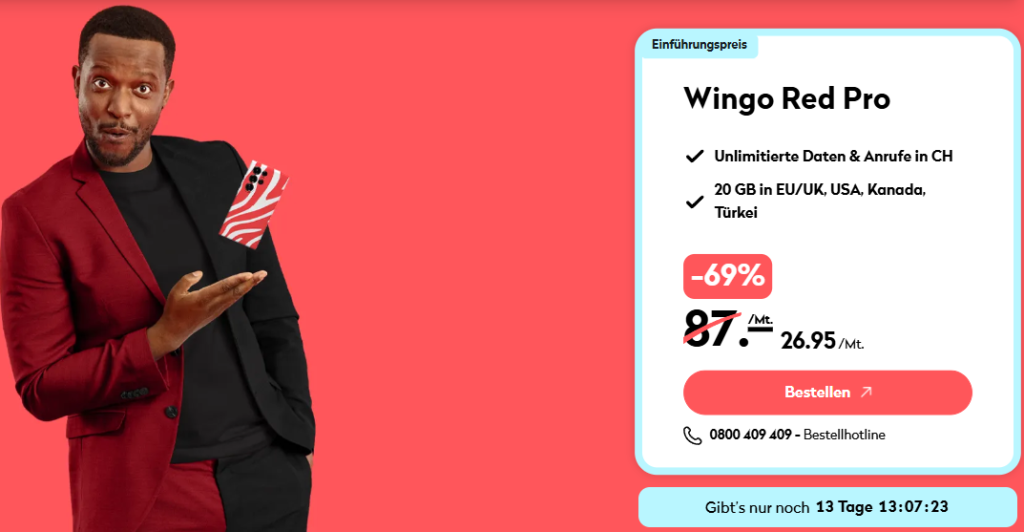 Tolles Angebot bei Wingo, man kann gerade das Handyabo Red Pro für 26.95 Fr. pro Monat abschliessen. Meiner Meinung nach ein wirklich tolles Angebot wenn man etwas mehr im Ausland unterwegs ist oder sich weniger Gedanken machen und trotzdem günstig unterwegs bleiben will.