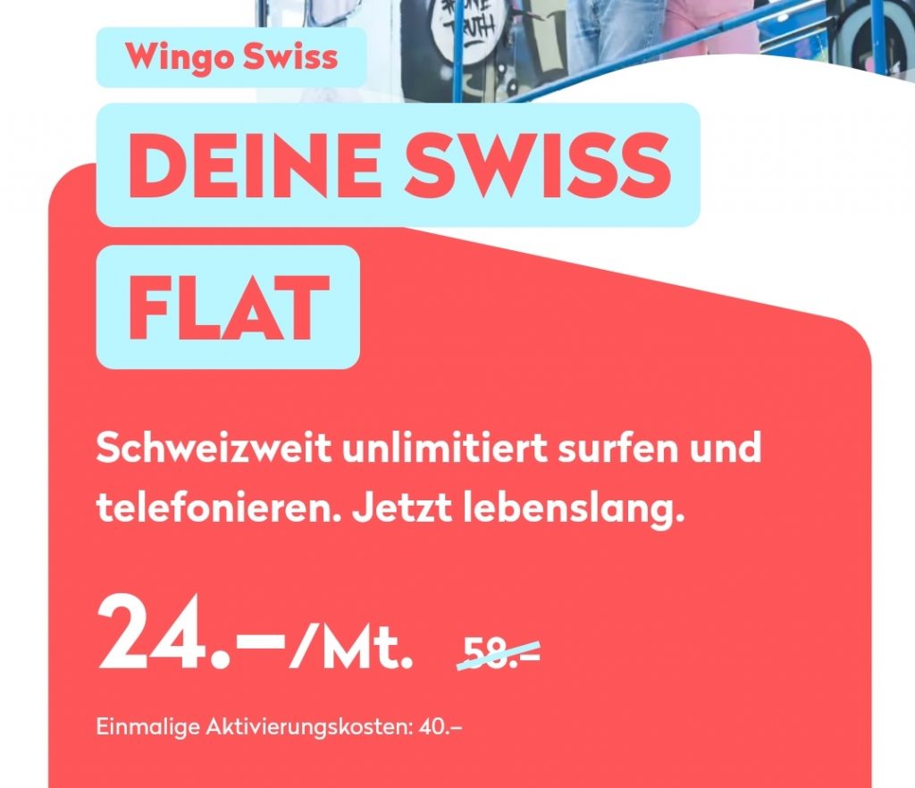Bei alao gibt es das Abo Wingo Swiss für CHF 24.- lebenslänglich. Die Aktivierungsgebühren werden auch geschenkt. Das Abo beinhaltet unbegrenzte Telefonie und Internet in der Schweiz.