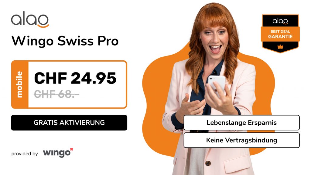 Bei alao gibt’s gerade das Wingo Swiss Pro Handyabo für CHF 24.95. Die Aktivierung ist gratis und der Rabatt gilt für immer. Es gibt keine Mindestvertragsdauer.