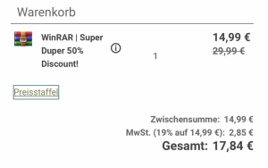 WinRAR ist normalerweise 33.- Fr, nach Anwendung eines willkürlichen Rabattes ist es bei 26.- Fr. Da ist der hier genannte Discount mit rd 15.- durchaus toll.
