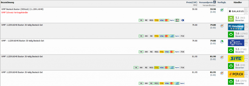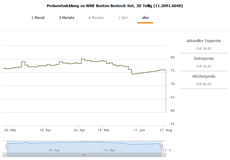 Gemäss toppreise gab es das Set bislang nie günstiger als für 74.40 CHF, der zweitbeste Preis liegt aktuell bei 79.80 CHF.