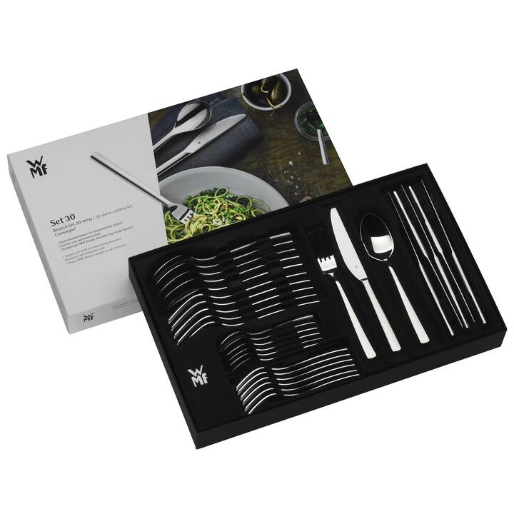Das 60-teilige Besteck-Set von WMF ist für 12 Personen ausgelegt und bietet Ihnen passend zu zahlreichen Speisen und Gängen je zwölf Menuegabeln, -messer und -löffel sowie Kuchengabeln und Kaffeelöffel. Damit Sie das Set finden, das Ihren individuellen Wünschen entspricht, gibt es die WMF Bestecke in verschiedenen Designs. Die 60 Teile sind eine gute Basis für tägliches Speisen und können mit weiteren Servier- und Ergänzungsbestecken vervollständigt werden – für eine vollendete Tischkultur.