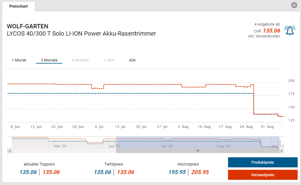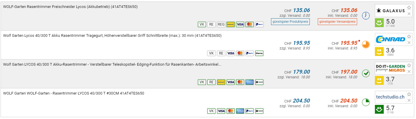 Bei Galaxus gibt es den WOLF-Garten Freischneider Lycos für den neuen Bestpreis von CHF 135.06. Der vorherige Bestpreis war CHF 191.-. Der zweitbeste Preis beträgt CHF 195.95.