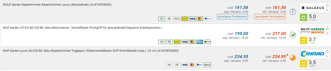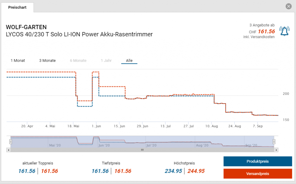 Bei Galaxus gibt es den WOLF-Garten Rasentrimmer Lycos für den neuen Bestpreis von CHF 161.56. Seit Anfang September fällt der Preis. Der zweitbeste Preis beträgt CHF 217.-.
