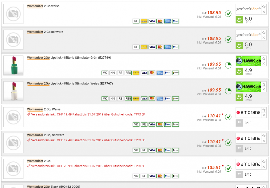 Mit dem Gutscheincode Wom2Go4Me erhält man bei Amorana den Womanizer 2 Go für CHF 89.- Zweitbester Preis im Moment scheint CHF 108.95 zu sein. Leider gibt’s auf toppreise keinen Preisverlauf, laut idealo war in Deutschland der Bestpreis bei 89 EUR.