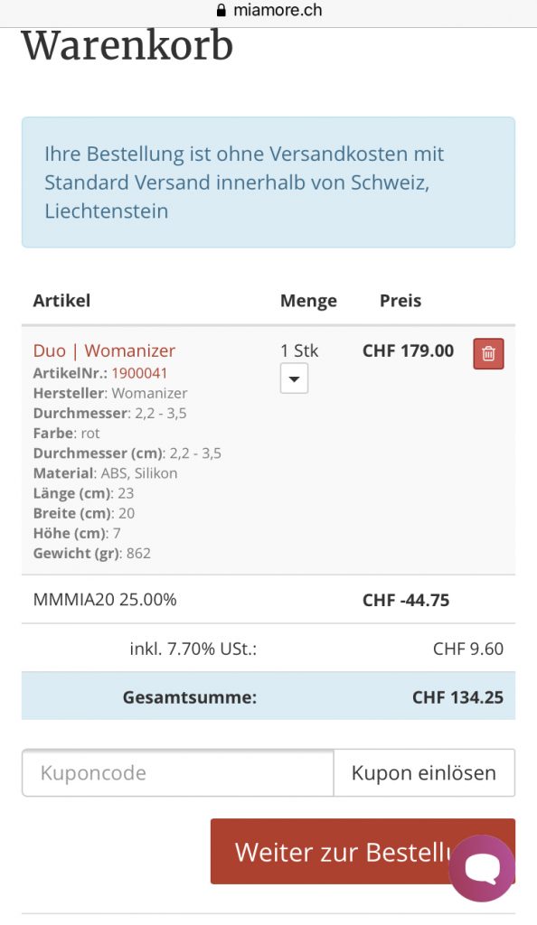 Der Womanizer ist heute in Aktion, zudem kann man ein 20% – Gutschein von 20 Min „MMMIA20“ eingeben und man erhält zusätzlich zum Aktionspreis die Prozente.