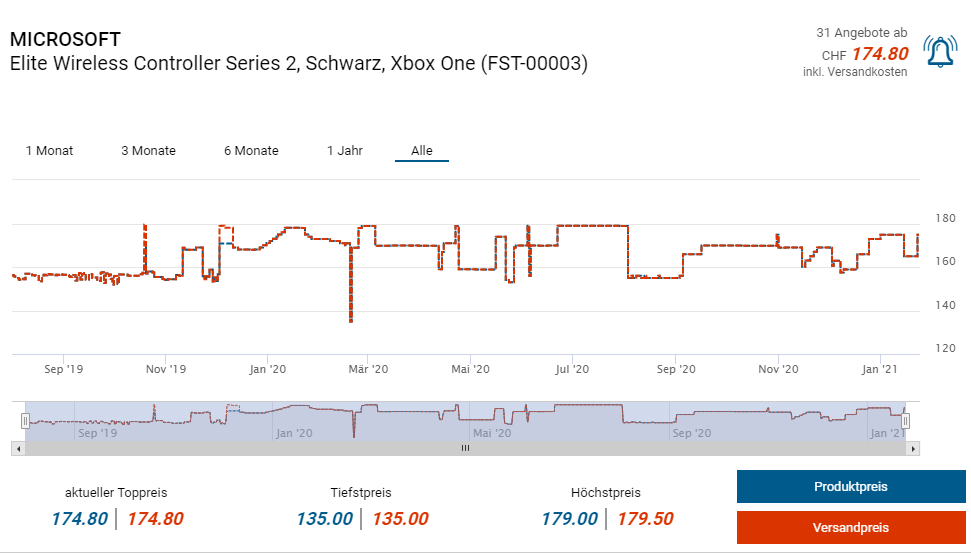 Bei Amazon gibts derzeit den Controller Xbox Elite Series 2 zum Aktionspreis von knapp 155 Franken. Laut toppreise liegt der Vergleichspreis derzeit bei fast 175 Franken, der Bestpreis lag in der Vergangenheit allerdings auch schon bei 125 Franken in diesem Deal.